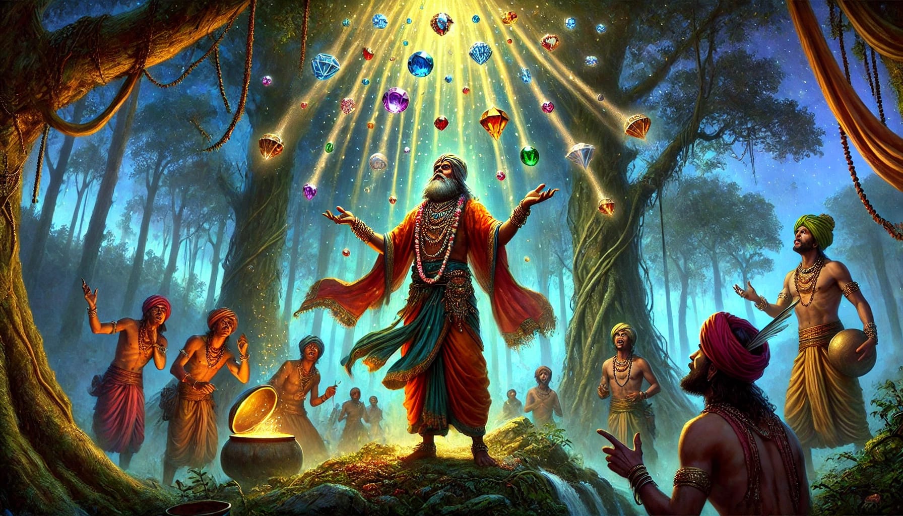 முன்னொரு காலத்தில், ஒரு கிராமத்தில் பிராமணர் ஒருவர் வாழ்ந்து வந்தார். அவருக்கு மாய மந்திரங்கள் பற்றிய ஆழமான அறிவும், அதனைச் செயல்படுத்தும் வசிய வித்தையும் இருந்தது. மக்கள் அனைவரும் அவரை பெருமையுடன் போற்றினர், ஏனென்றால் அவர் வானத்தில் கிரகங்கள் ஒரு குறிப்பிட்ட நிலையில் இணையும் நேரத்தில் ஒரு மந்திரத்தைச் செபித்தால், வானத்திலிருந்து தங்கம், வெள்ளி, வைரம், முத்து, கோமேதகம், கெம்பு போன்ற நவரத்தினங்கள் மழையாகப் பொழியும் என்பதற்கான திறமை அவரிடம் இருந்தது!