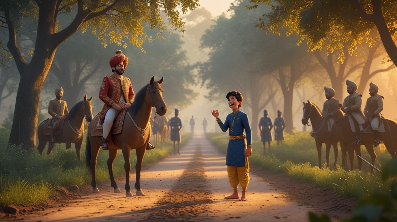 மன்னர் அவனை அழைத்து, “ஏய் சிறுவனே! ஆக்ராவிற்கு செல்லும் சாலை எது?” என்று கேட்டார். சிறுவன் சிரித்துக்கொண்டே, “ஹுஸூர், சாலைகள் நகர முடியாது என்று எல்லோருக்கும் தெரியும். அதனால் இந்த சாலைகள் எப்படி ஆக்ராவுக்கோ அல்லது வேறு எங்கோ செல்ல முடியும்?” என்று சொல்லிவிட்டு தன்னுடைய நகைச்சுவைக்கு தானே சிரித்தான்.